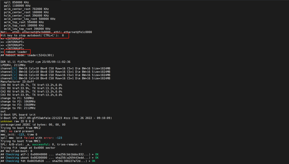Type-C 数据线接好后在断电重启时在串口调试终端快速按ctrl + c进入uboot,输入reboot loader进入烧写模式(也可在断电时使用小工具按住REC孔的按键,然后上电,等待进入烧写模式后松开即可)